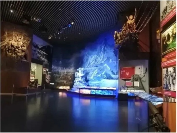以上圖所展示的渡江戰(zhàn)役”場景為例,謳歌了中國人民解放軍以木帆船為主要航渡工具,一舉突破國民黨軍的長江防線,并以運(yùn)動(dòng)戰(zhàn)和城市攻堅(jiān)戰(zhàn)相結(jié)合,合圍并殲滅其重兵集團(tuán)。場景的展品內(nèi)容非常豐富,其中包含一級(jí)標(biāo)題版、圖文展板、人物雕塑、浮雕造型墻、金屬立體字、展柜、燈箱、多媒體等重要文物展品,光影的過渡變化也很自然,既有突出翻越大雪山時(shí)艱苦環(huán)境的冷色調(diào),也有勝利跨江會(huì)師后讓人喜悅的暖色調(diào)。